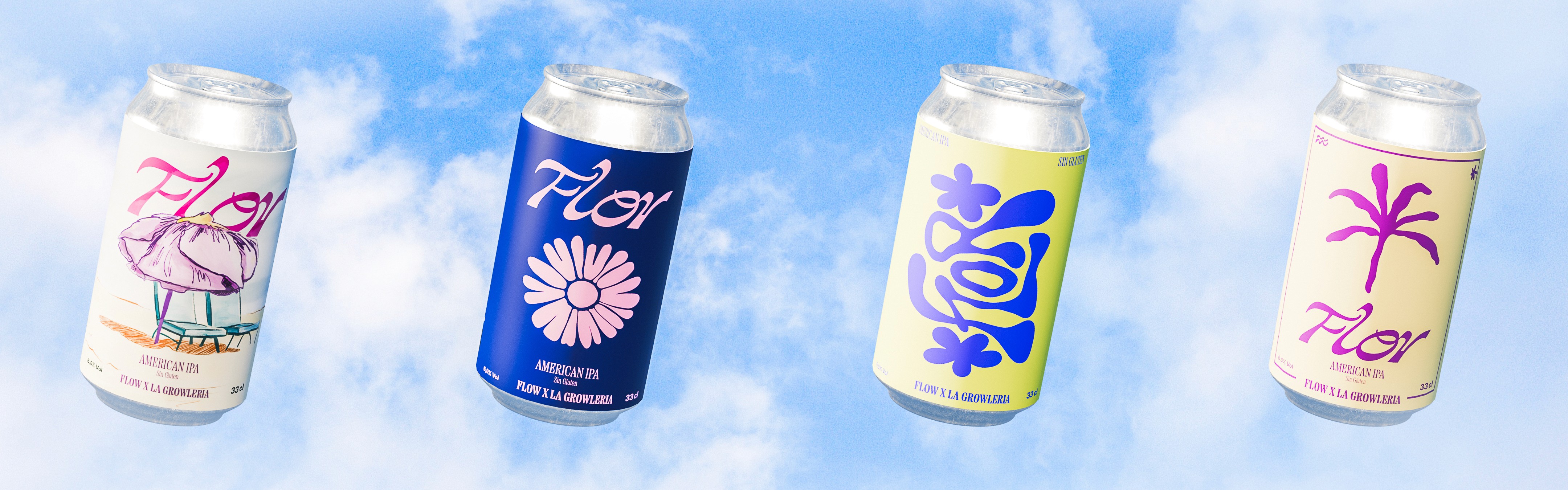 El diseño de la etiqueta de la cerveza Flor by Flow se desarrolló a partir de varias iteraciones ilustradas digitalmente a mano, de las cuales se seleccionó una propuesta principal y tres secundarias. Todas las etiquetas giran en torno al concepto de verano, con un estilo llamativo, juvenil y fresco, pensado para transmitir la esencia lúdica de la marca.