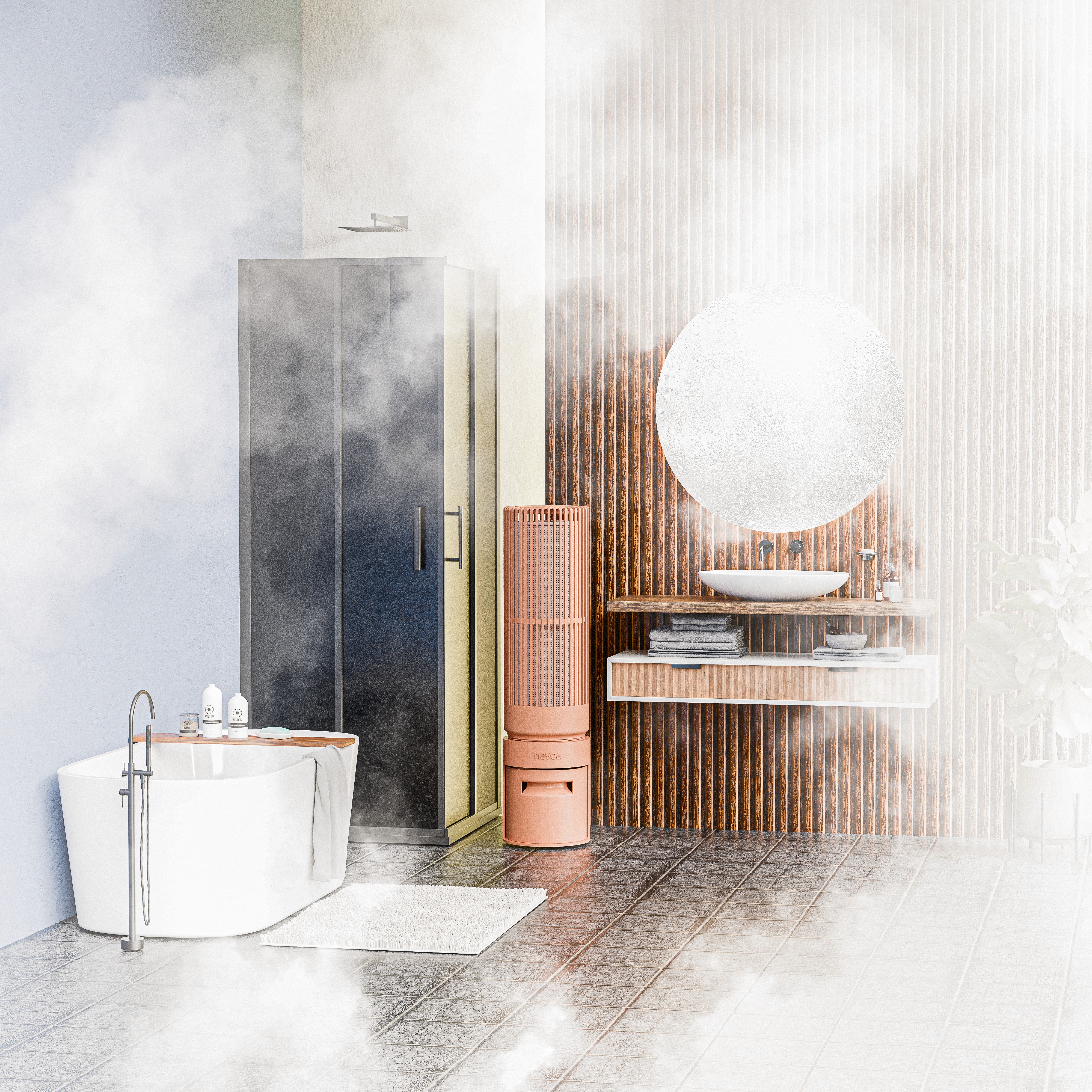 Nevoa es un deshumidificador biomimético compuesto por materiales sostenibles y biodegradables, que permite absorber el vapor e integrarse en espacios previamente existentes sin necesidad de modificar la estructura de la vivienda.
