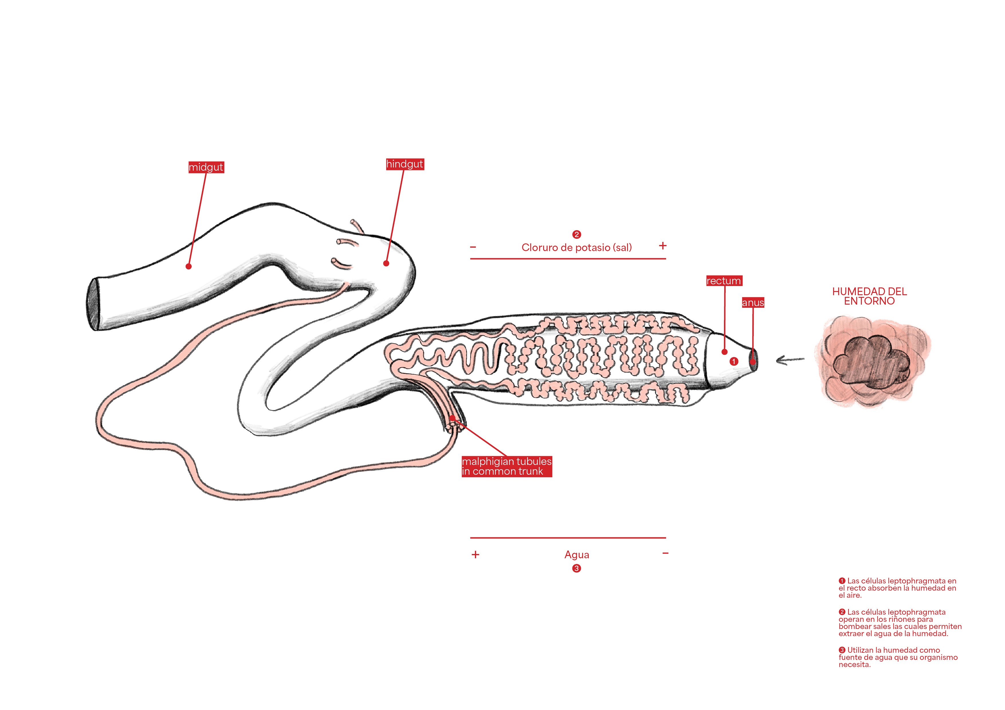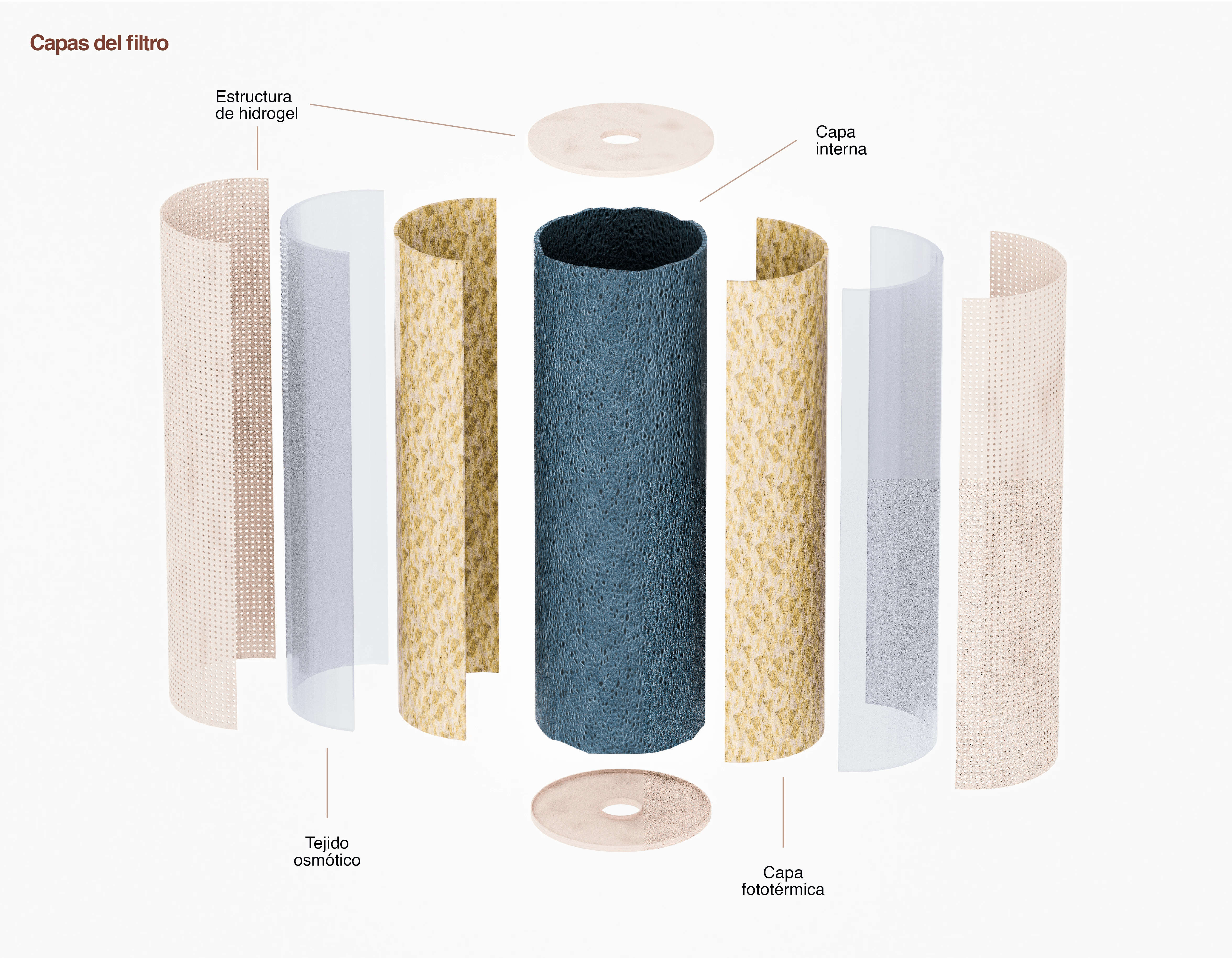 Nevoa está inspirado en la fisiología y mecanismo del Tribolium castaneum (Gorgojo Rojo de la Harina), un insecto que en lugar de sobrevivir a partir de agua líquida, captura la humedad del aire mediante un sistema de absorción en el recto que permite la captura del vapor en el aire mediante las células Leptophragmata, las cuales trabajan en conjunto con el recto y los riñones del escarabajo para que absorba el vapor, se nutra y tenga la habilidad de vivir en lugares desérticos³. Este principio biológico es desarrollado en Nevoa como un sistema multicapa que replica la manera en la que el organismo captura, conduce y transforma el vapor en agua.