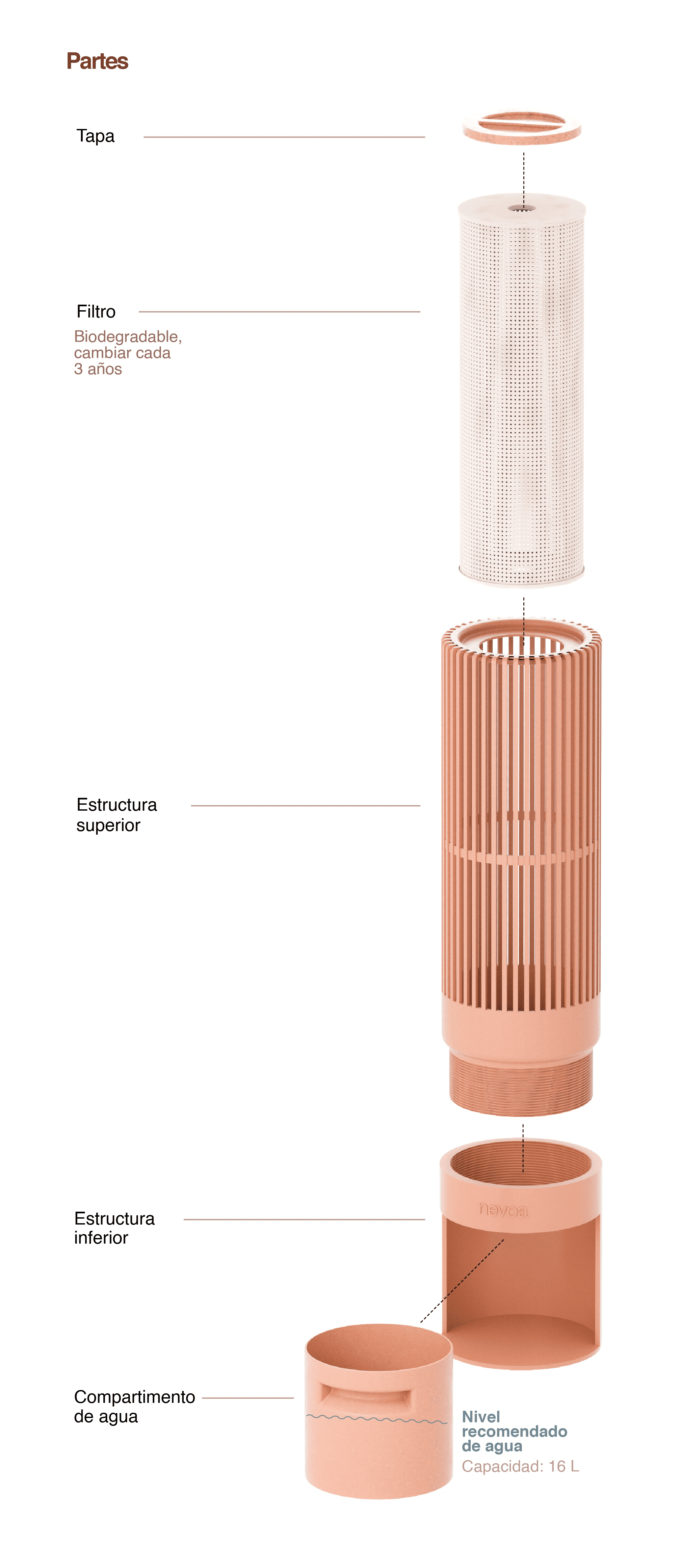 Está conformado por materiales completamente biodegradables, que absorbe vapor del aire por medio de un filtro poroso y osmótico. Este condensa y conduce la humedad dentro de un depósito inferior, el cual puede separarse del filtro y utilizar el agua recolectada para usos secundarios (limpieza, riego, etc.). Nevoa funciona sin electricidad y es completamente independiente, transportable y portátil.